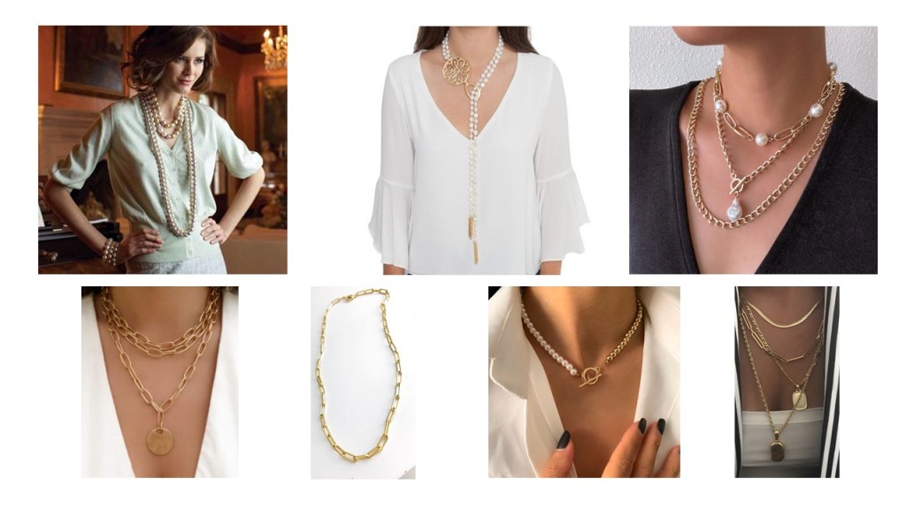 Cuando combinen pantallas con collares, les recomiendo que siempre que vayan a llevar un collar o varios muy vistosos, las mismas deben ser pequeñas, puesto que no debemos lucir muy cargadas. Igualmente si las pantallas son muy grandes o llamativas, debe utilizarse un collar pequeño que no llame mucho la atención. Esta regla es en cuanto a ocasiones especiales y en ambientes de trabajo. Igualmente las sortijas y pulseras deben usarse con discreción en estos ámbitos.